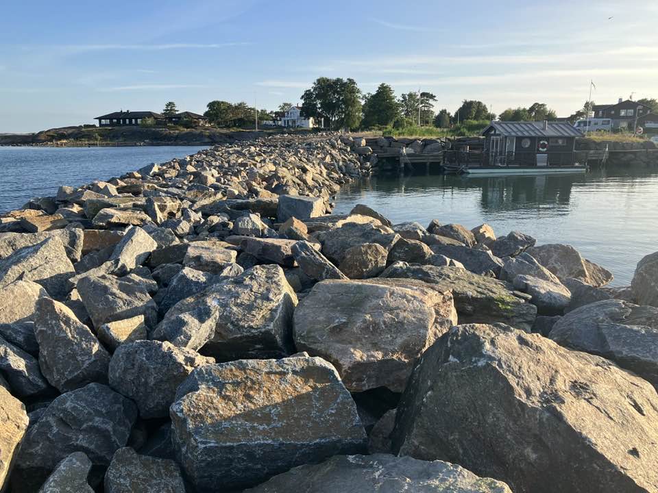 Ett omfattande arbete med att förlänga och bredda stenpiren ute på Hästholmen. En viktig framtidssäkring som gör att vår brygga nu har ett bra skydd vid hårda vindar och höga vågor.